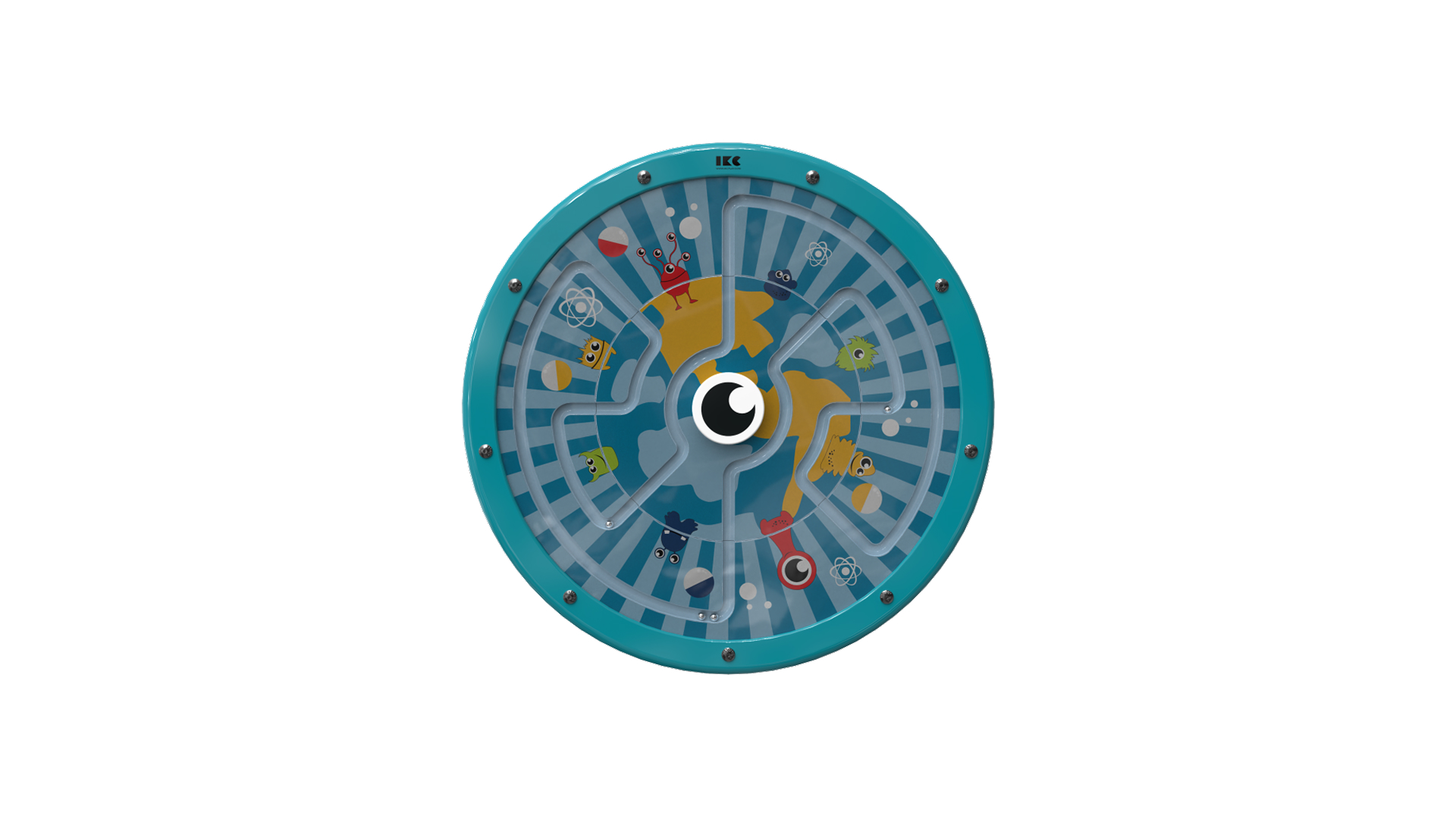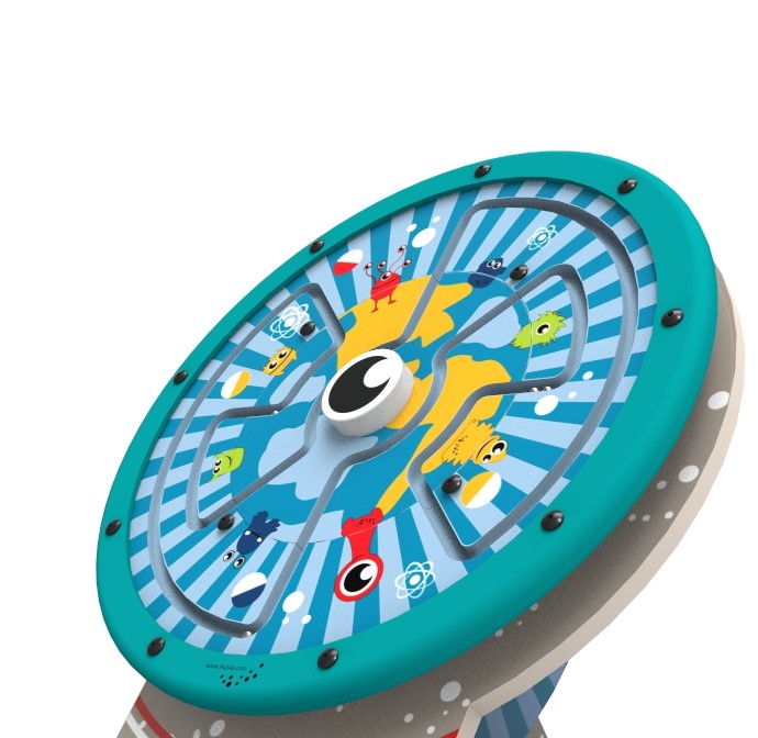 לוח משחק קיר מעגלי בו הילדים מלווים כדורים במסלול חללי צבעוני על ידי סיבוב “העין” שבמרכז – שמובילה את המפלצות החמודות בין כוכבים, בועות ואטומים.