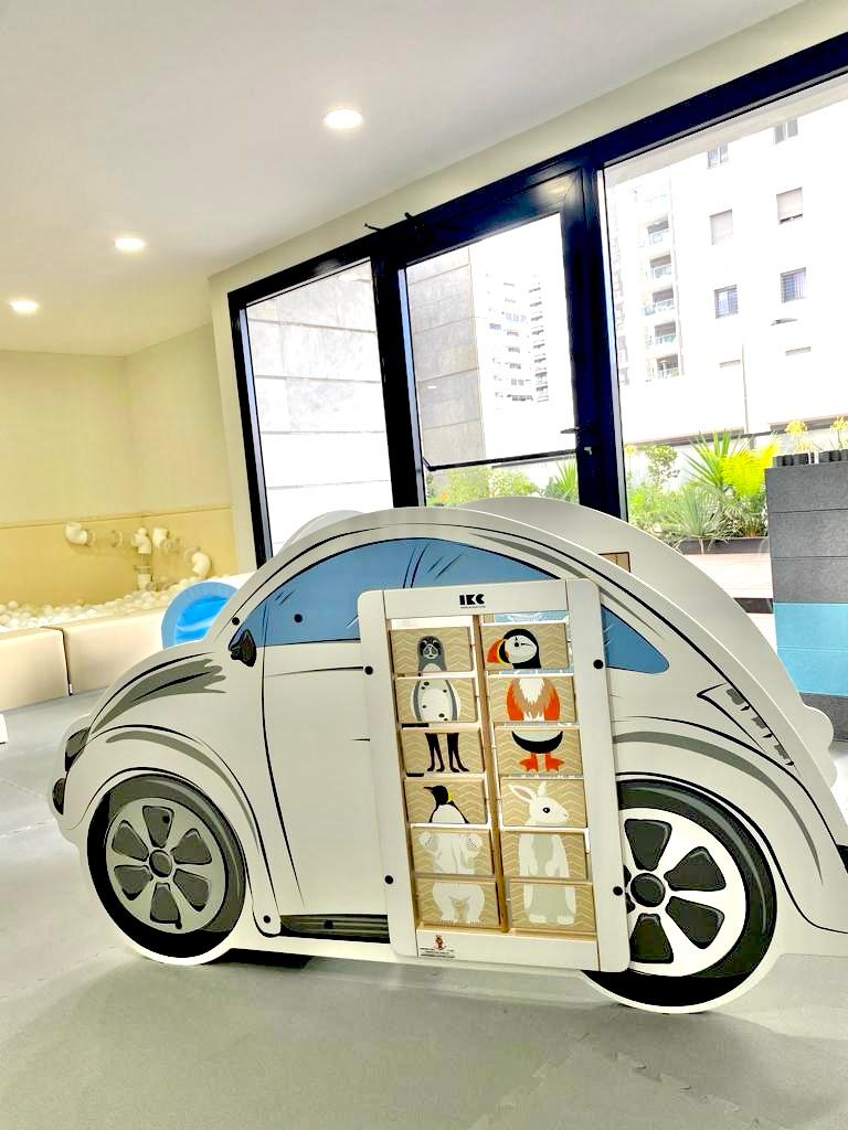 במרכז הפינה בולט רכב המשחק המעוצב, אלמנט אינטראקטיבי שמזמין את הילדים לעצור, לגעת ולשחק בשקט.