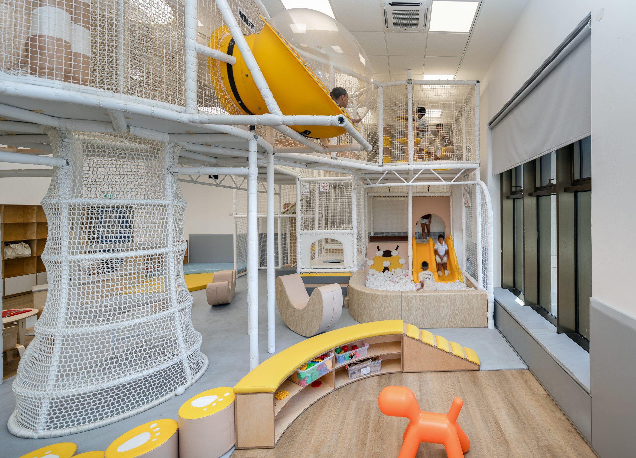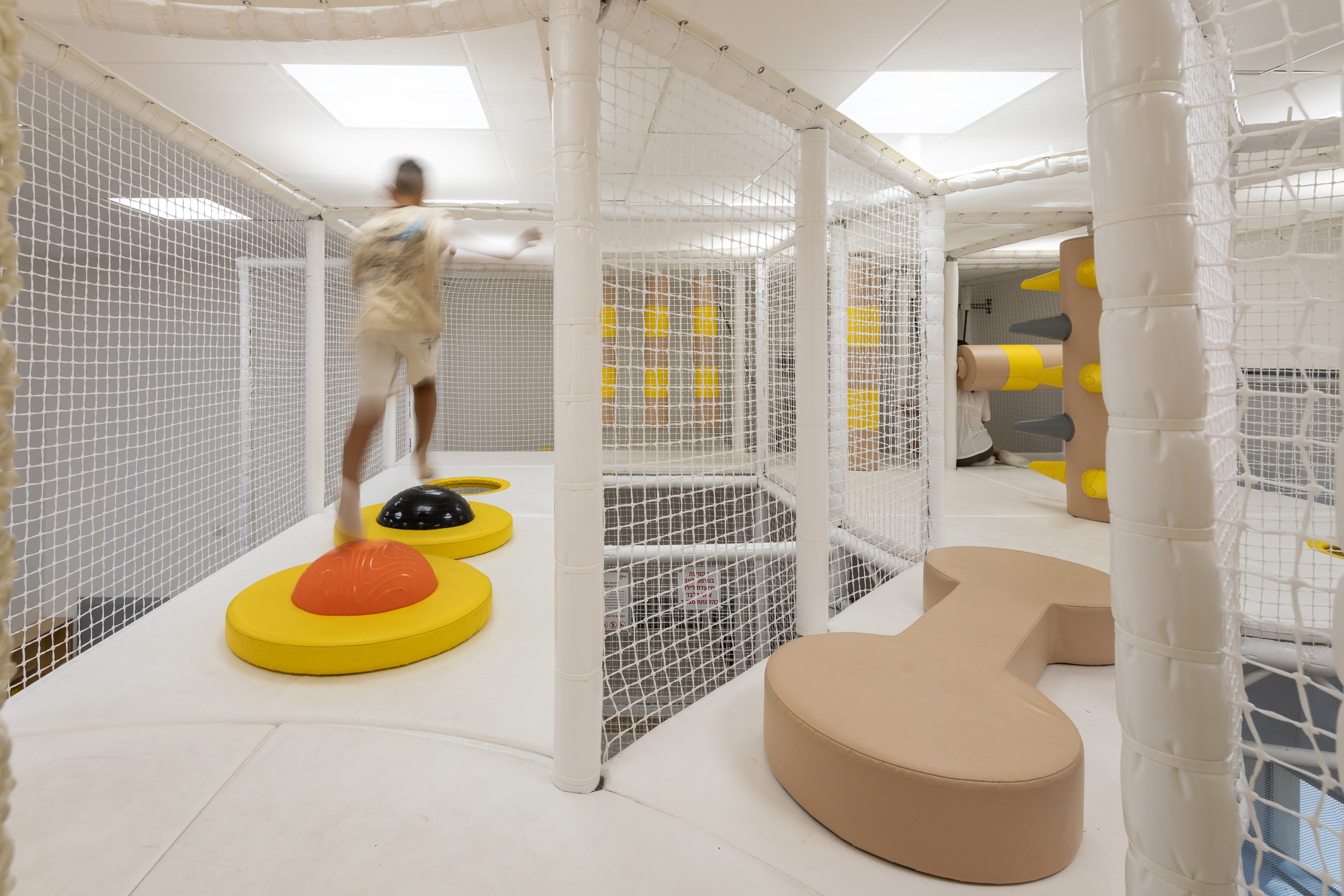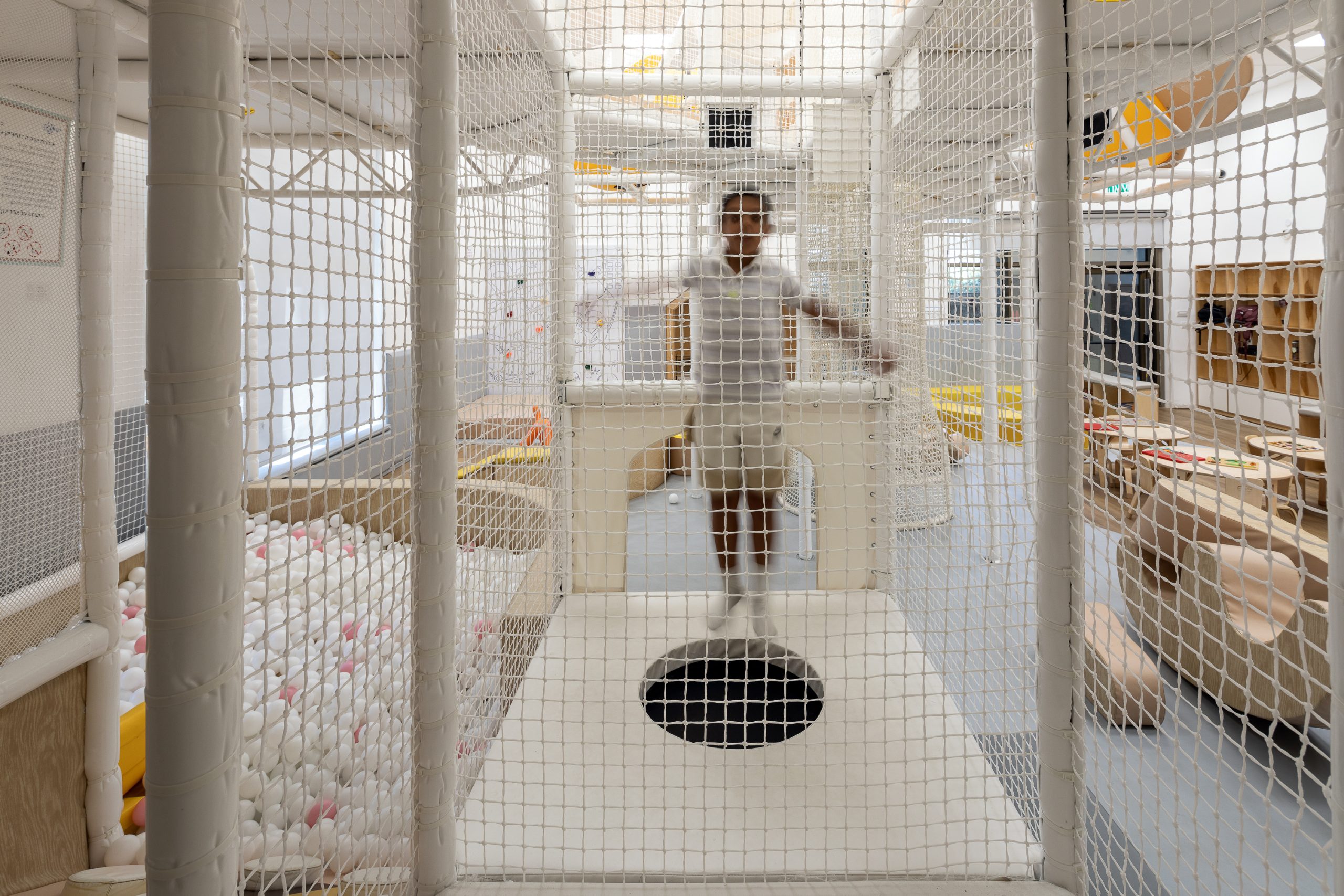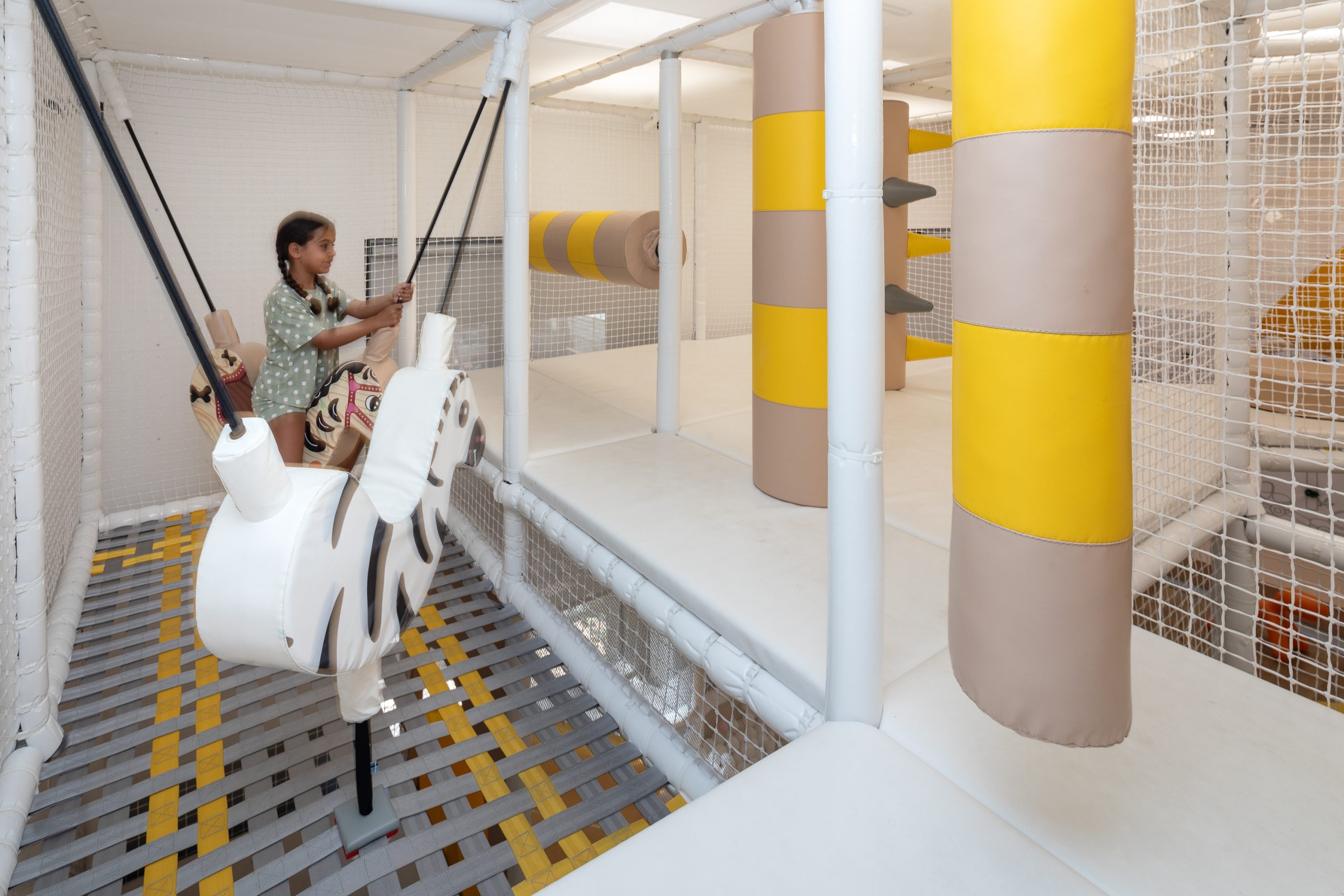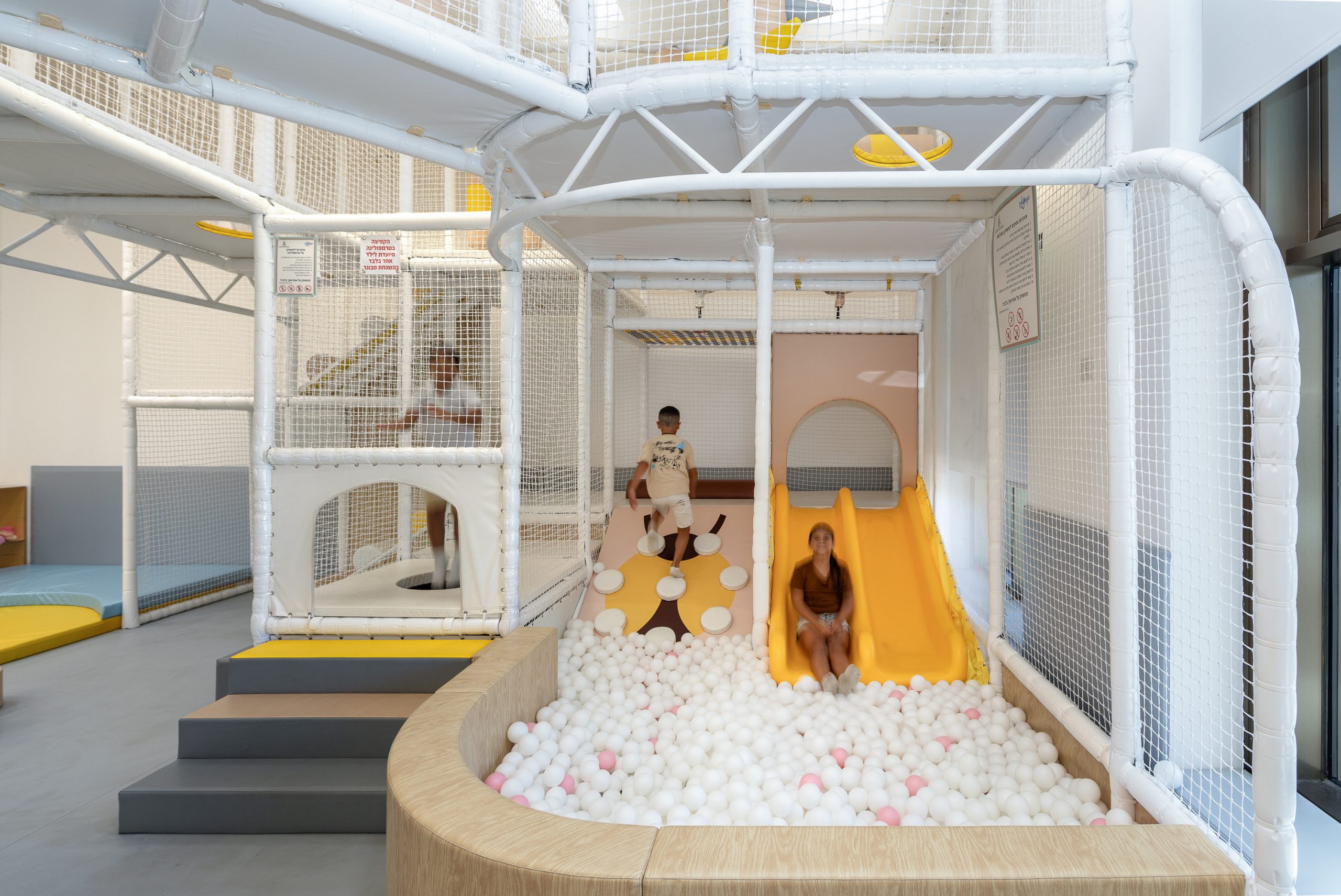 משחקייה דו קומתית הכוללת מתקן רב מרחב עם אלמנט טיפוס במרכז החלל